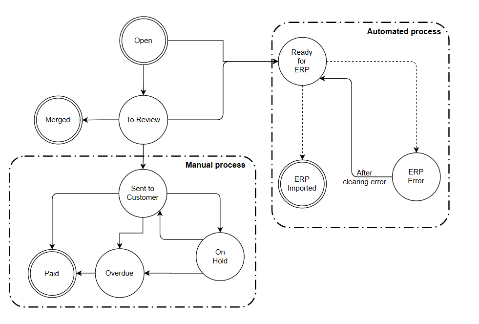 The invoice lifecycle is managed through its status. By referring to this lifecycle, you can determine which statuses an invoice can transition to at each stage